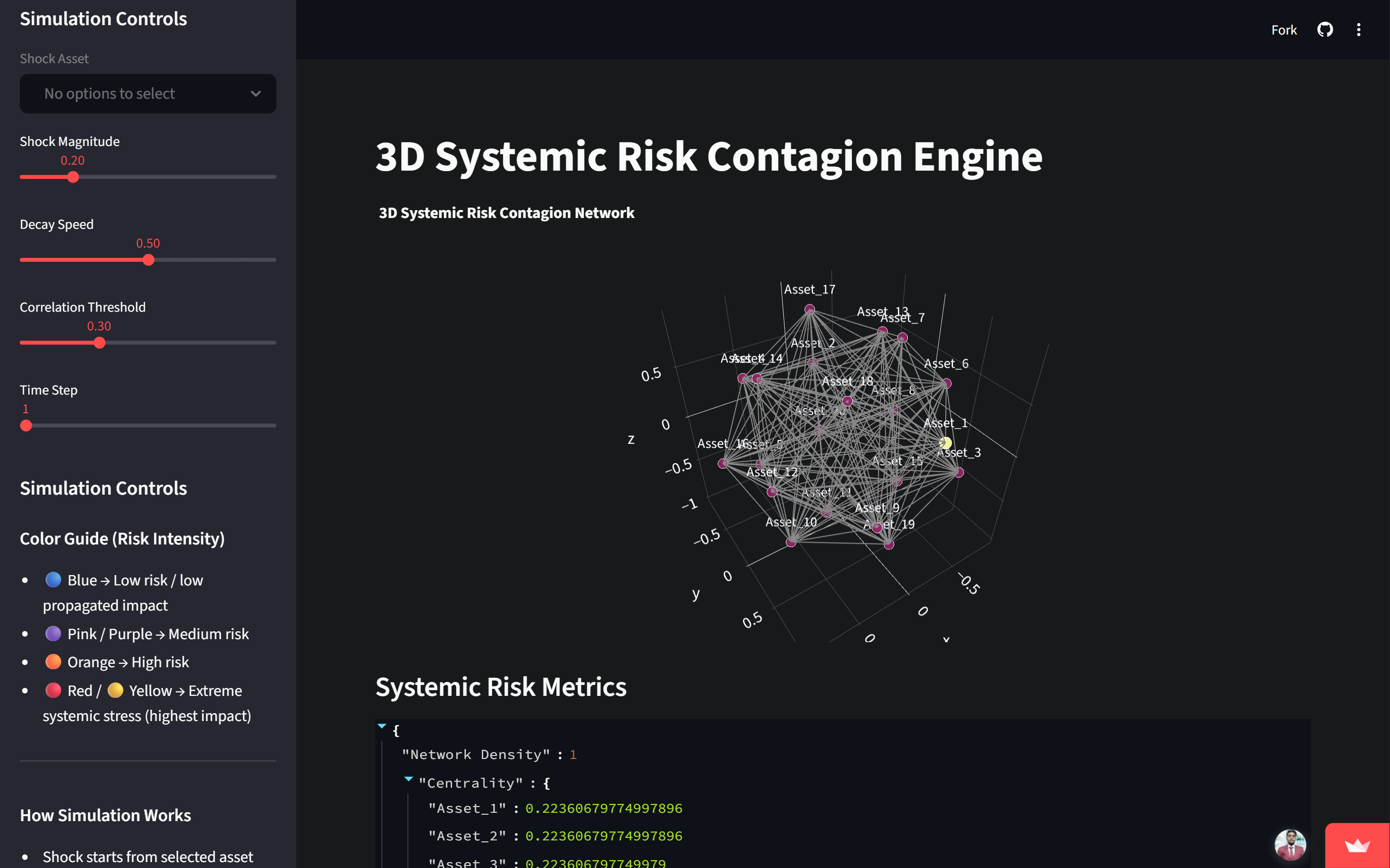 An interactive analytics dashboard that simulates systemic risk propagation across interconnected financial assets. Built using network analysis and dynamic shock modeling, the project visualizes how financial shocks spread through correlation-based networks with adjustable parameters, real-time metrics, and 3D visualization.